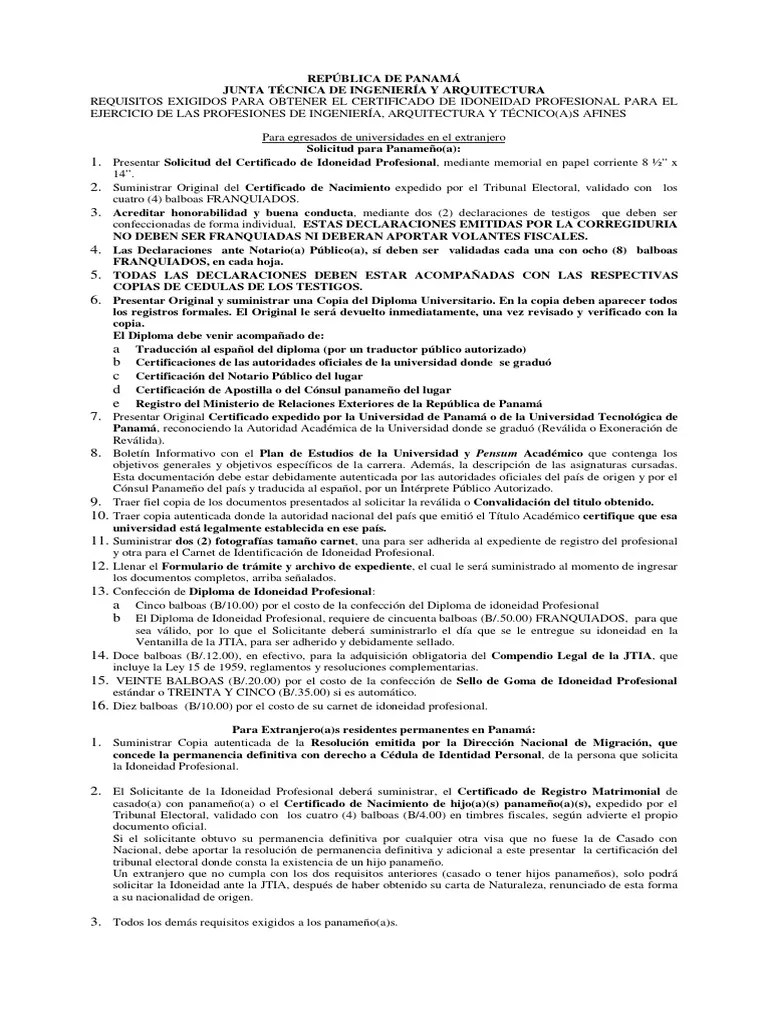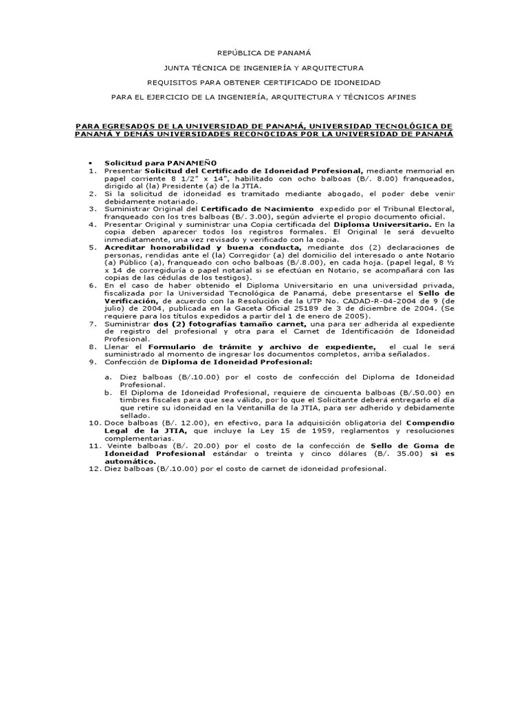 La idoneidad se denomina como la cualidad de idóneo. La junta técnica de ingeniería y arquitectura (jtia), es la entidad de derecho público creada mediante la ley 15 de 26 de enero de 1959, por la cual se regula el ejercicio de las profesiones de ingeniería y arquitectura en panamá, modificada por las leyes 53 de 4 de febrero de 1963 y 21 de 20 de junio de 2007.. República de panamá junta técnica de ingeniería y arquitectura requisitos exigidos para obtener el certificado de idoneidad profesional para el ejercicio de las profesiones de ingeniería, arquitectura y técnico(a)s afines para egresados de universidades en el extranjero solicitud para panameño(a):